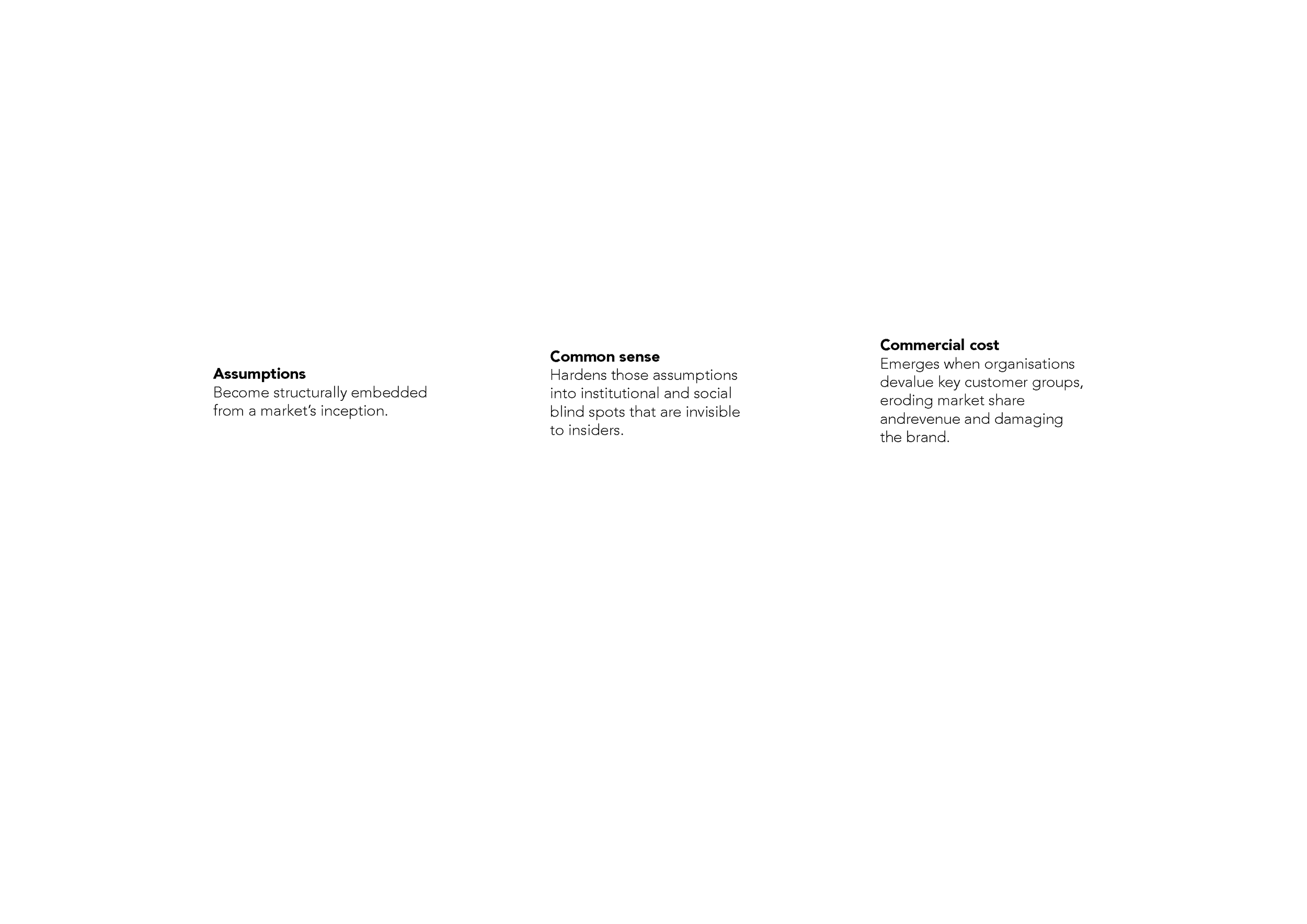 Most diagnostics treat symptoms—flat growth, failed campaigns, reputational flare‑ups. Legacy Lag goes upstream to diagnose the structural assumptions creating those problems, before they surface in the work. It combines cultural theory with commercial evidence, so recommendations land as strategic levers, not as generic diversity advice.
